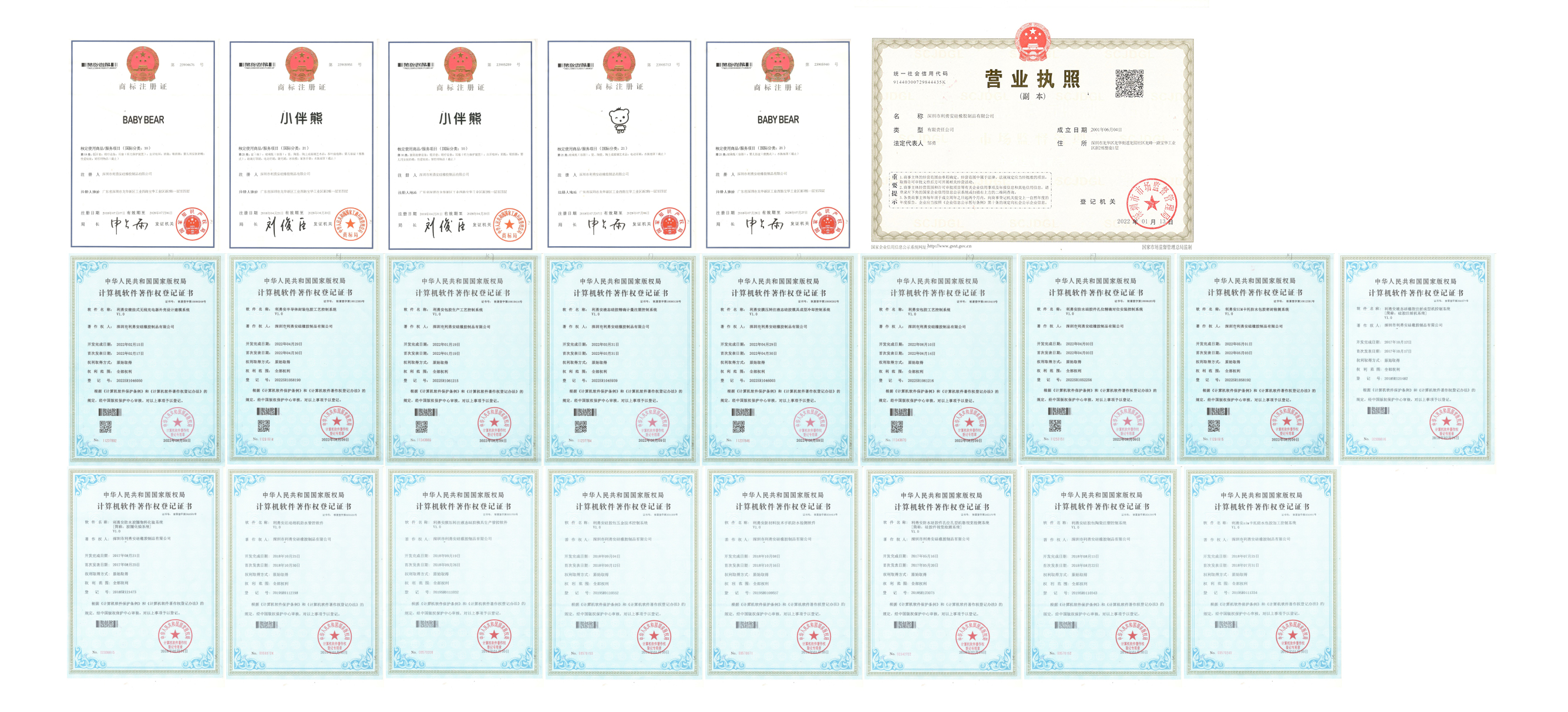 自 2001 年創立伊始,利勇安深耕硅膠制品領域,以創新驅動發展,持續進行技術研發與工藝革新,構建起堅實的知識產權壁壘。截至目前,公司已成功斬獲 10 余項國家專利證書,涵蓋產品設計、生產工藝及模具制造等多個維度。