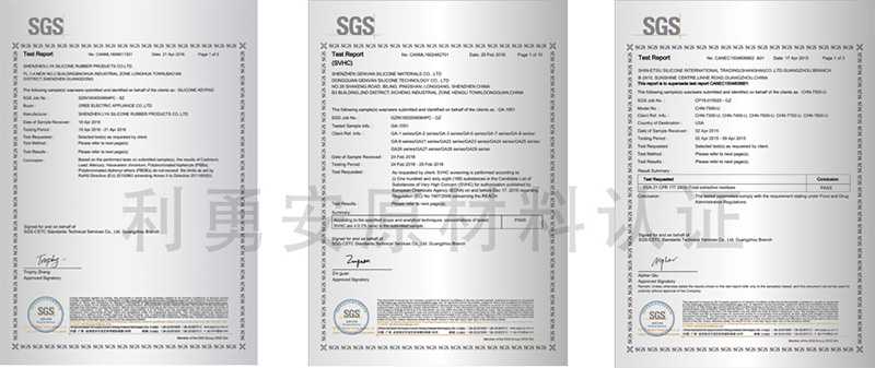 我們的硅膠原材料都經(jīng)過了國(guó)際認(rèn)證標(biāo)準(zhǔn),認(rèn)證報(bào)告分別有(ROHS、鹵素、PAHS、REACH、FDA、LFGB、MSDS、USP、NSF、UL黃卡等)。
