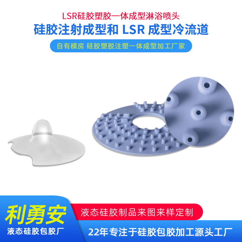 LSR硅膠塑膠一體成型淋浴噴頭硅膠注射成型和 LSR 成型冷流道 液態(tài)硅膠包膠加工 自有模房 硅膠塑膠注塑一體成型加工廠家
