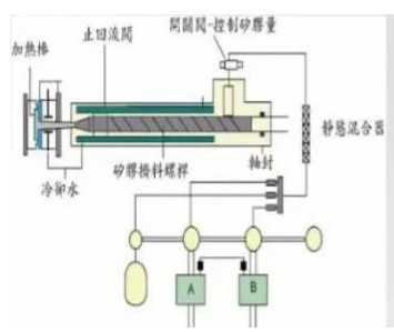 LSR為雙組分的液態(tài)材料,分為 A 組分和 B 組分,混合機(jī)的工作將A 組分和 B 組分以精確的 1:1 比例充分混合。又因部分制品為有色設(shè)計(jì),所以配有顏色泵組及顏色計(jì)量部分。A+B 組分、添加劑、顏色等充分混合后進(jìn)入塑化系統(tǒng)。這種塑化螺桿同時(shí)具有均化、混合的功能,通過螺桿將混合料注射到熱模具中,在模溫 170~200℃下,硅膠發(fā)生固化反應(yīng)。當(dāng)使用冷流道系統(tǒng)時(shí),值得注意的是流道要足夠冷。為了避免漏膠,針閥安裝在模具部件的表面,射膠完畢時(shí),針閥立即封閉射嘴。